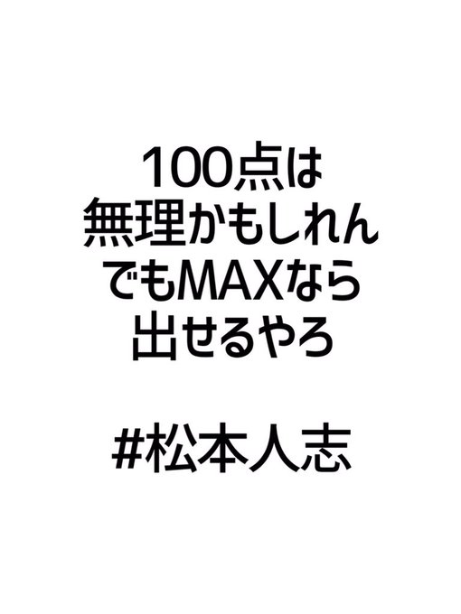 で出てきました「松本人志」の名言を書きだしましたので、改めて読み直してみると感がい深いものがでてくると思いますよ。 100点は無理かもしれん。 でもMAXなら出せるやろ。 幸せとは自分が不幸なことに 気づいていないことだ。松本人志の名言。 全個。 100点は無理かもしれんでもMAXなら出せるやろ。 僕はただ笑いの才能があるから、お笑いをやっているのではない。 まず才能があり、好きだから、お笑いを追及しているのだ。 幸せとは自分が不幸せなことに気付いていない 松本人志の名言・格言一覧 前の記事 松本人志『世界で一番面白くない人は、実は一番面白い。』 次の記事 松本人志『未完成でも一生懸命やったら伝わるもんやなぁ。